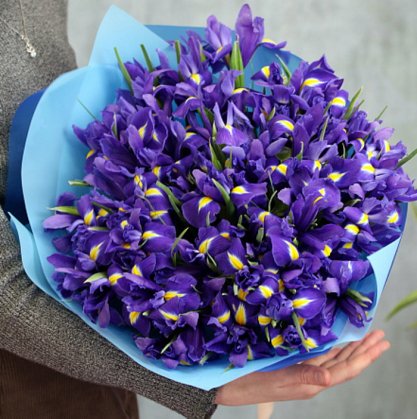 Букет из пышных ирисов синего цвета. Упаковка выполненна из матовой пленки.