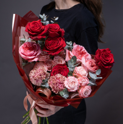 Букет из качественных красных роз Эксплорер, нескольких сортов пионовидных роз и диантусов - идеальный вариант для 14 февраля. Такой букет донесет сообщение о ваших чувствах и выразит признательность и уважение к вашему возлюбленному.