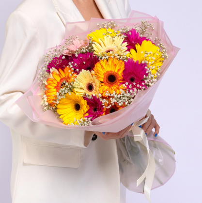 Разноцветные, крупноголовые герберы с гипсофилой в упаковке.
