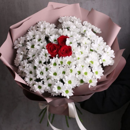 Букет хризантем с розами в центре | Заказать цветы в Серпухове