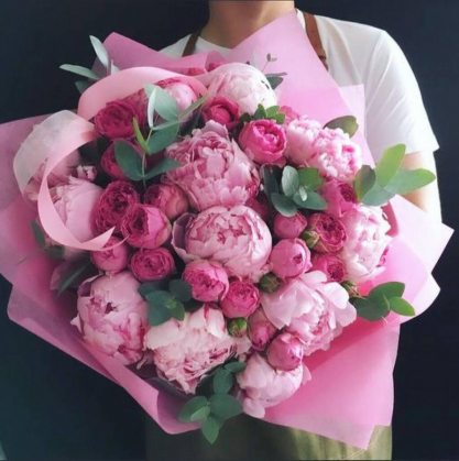 Букет из пионов и пионовидных роз с добавление эвкалипта.