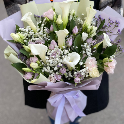 Очень красивый букет из белых калл, нежных лизиантусов, гипсофилы и кустовой розы. Состав букета можно изменить на ваше усмотрение.