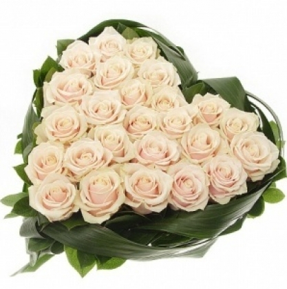 Композиция из 25 белых роз, выложенных в форме сердца, окантовка из аспидистры и рускуса.