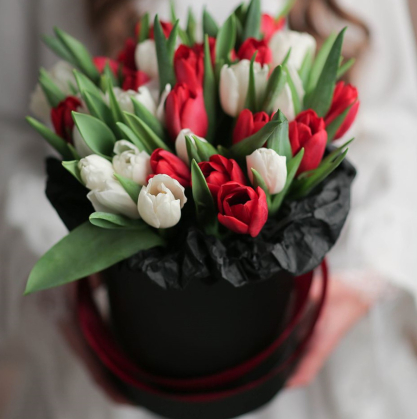 Коробка красных и белых тюльпанов | Купить в Серпухове