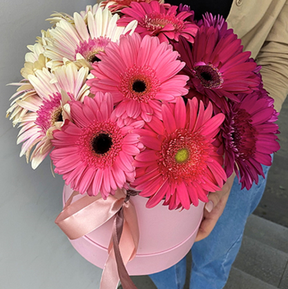 Шляпная коробка из крупных гербер. Пожелания по цвету можно оставить менеджеру при оформлении заказа