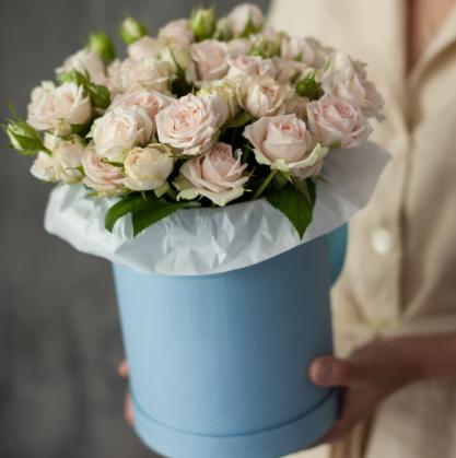 Очень нежная шляпная коробка с кремовыми кустовыми розами. При этом вы можете сделать композицию более объемной, просто увеличив количество роз.