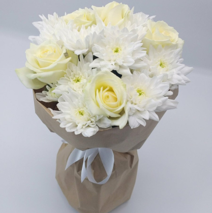 Этот букет сочетает в себе красоту и роскошь белых хризантем и роз. Изящный и элегантный, воздушный, с нотками спокойствия и гармонии. Такие цветы идеально подходят для важного события или как подарок для близкой личности.