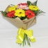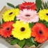Яркий букет из гербер с добавлением рускуса и папоротника в стильной крафт упаковке.