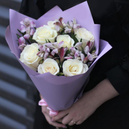 Небольшой, но при этом очень милый букетик. Белые розы Эквадор. Альстромерия сиреневая Голландия. По вашему желанию в букет можно добавить зелени.