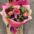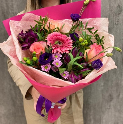 Букет из роз, гербер, альстромерий, лизиантусов и хризантем с добавлением гиперикума и фисташки в стильной упаковке