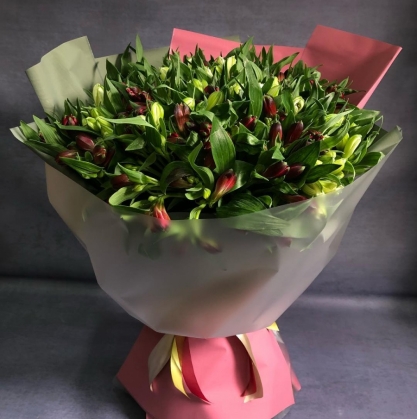 Большой букет из разноцветных альстромерий в стильной матовой упаковке