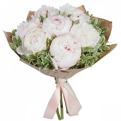 Стильный букет из пионов с добавлением питтоспорума в крафт бумаге. Упаковку можно изменить на матовую пленку или фетр при вашем желании.